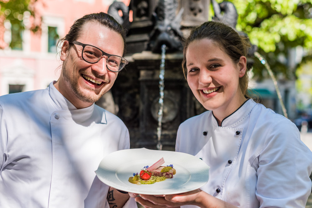 Bild: Küchenchef Benjamin Biedlingmaier mit Kollegin Meike Blickheuser. Foto: Sebastian Thiel